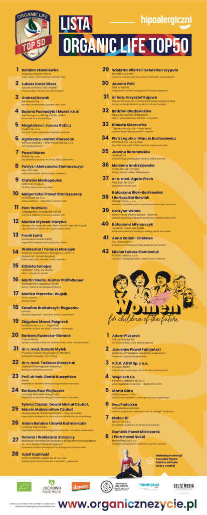 Już znamy nazwiska laureatów Plebiscytu Ekologicznego Lista ORGANIC LIFE TOP 50, którzy zostali docenieni przez Jury składające się przede wszystkim z naukowców zorientowanych na ekologię, etykę i edukację. Spośród 88 Nominowanych w tym roku – drogą obrad – Jury wybrało 42 Laureatów i 8 osób wyróżnionych. Gala Finałowa miała miejsce 17 września 2022 r. na terenie Atlas Areny podczas drugiego dnia Targów Natura Food i beECO na zaproszenie Miejskiej Areny Kultury i Sportu Sp. z o.o. w Łodzi.
